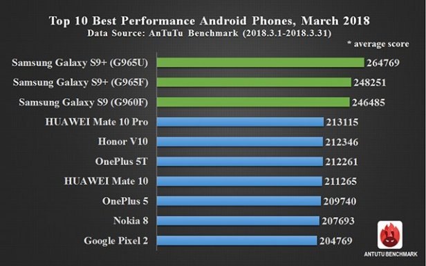 Σύμφωνα με την antutu, τις τρεις πρώτες θέσεις, καταλαμβανουν τρεις διαφορετικές εκδόσεις του απίστευτου Samsung Galaxy S9,με μεγάλη διαφορά από τους υπόλοιπους.