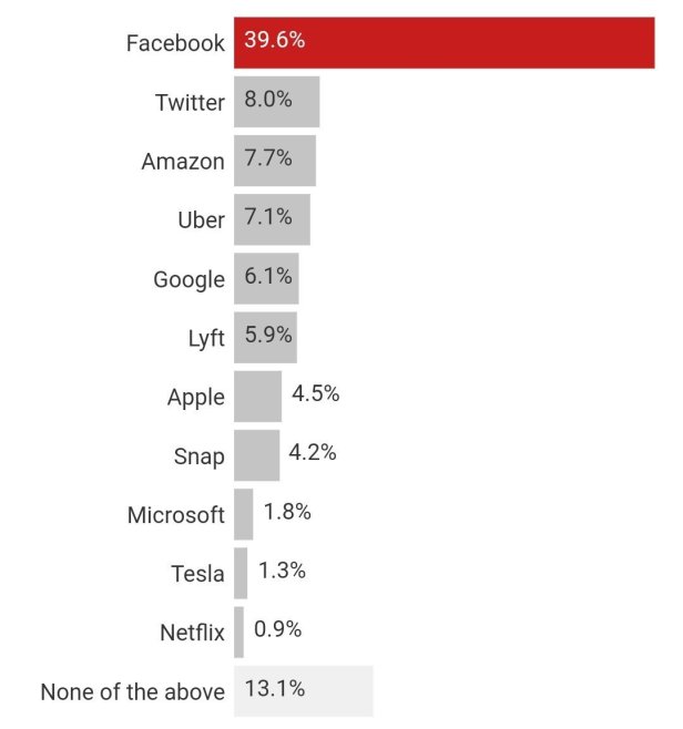 Την λίστα των αναξιόπιστων εταιρειών συμπληρώνουν οι Amazon και Twitter με ποσοστό 8% η καθεμιά, η Uber με ποσοστό 7% και η Google με ποσοστό 6%. Ποσοστό 6% κατέλαβε επίσης και η Lyft. Σε καλύτερη μοίρα βρίσκονται η Apple με ποσοστό 4% και η Microsoft με ποσοστό 2%.