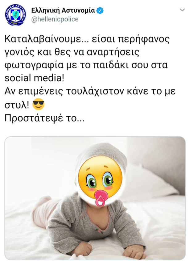 Για άλλη μια φορά, η Ελληνική Αστυνομία προειδοποιεί για τους κινδύνους που παραμονεύουν από την δημοσίευση φωτογραφιών των παιδιών στο διαδίκτυο σε ανάρτησή της στο Tweeter. Συγκεκριμένα αναφέρει: