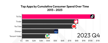 Είναι η πρώτη εφαρμογή (συμπεριλαμβανομένων των παιχνιδιών) που έφτασε τα 10 δισεκατομμύρια δολάρια σε συνολικές καταναλωτικές δαπάνες. Μόλις πριν από λίγα χρόνια, το να φτάσει εφαρμογή το ένα δισεκατομμύριο δολάρια έμοιαζε σαν όνειρο. Τώρα, το TikTok κερδίζει πάνω από ένα δισεκατομμύριο κάθε τρίμηνο! Τα περισσότερα από αυτά τα μετρητά προέρχονται από χρήστες που αγοράζουν νομίσματα για φιλοδώρημα δημιουργών κατά τη διάρκεια ζωντανών ροών.