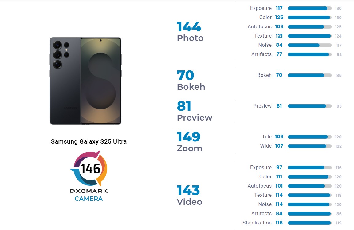 Το S25 Ultra,δοκιμάστηκε από τη μεγαλύτερη παγκόσμια πλατφόρμα ελέγχου φωτογραφίας και κάμερας και άφησε πολύ καλές εντυπώσεις. Το συγκέντρωσε 146 πόντους, παραμένοντας πίσω από τους μεγάλους αντι[πάλους του, αλλά βελτιώνοντας την βαθμολογία του προκατόχου του. Πρώτο κινητό σε κάμερα παραμένει το εκπήκτικό Pura 70 Ultra, ακολουθούμενο από δύο εξαιρετικά κινητά, το περσινό Honor Magic 6 Pro και το Pixel 9 Pro XL.
