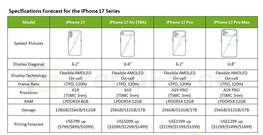 Τα iPhone 17 Air, iPhone 17 Pro και iPhone 17 Pro Max θα έχουν όλα 12GB RAM και θα ξεκινούν από 256GB αποθηκευτικού χώρου, αφήνοντας μόνο το «vanilla» iPhone 17 με 8GB RAM και 128GB βασικό αποθηκευτικό χώρο.