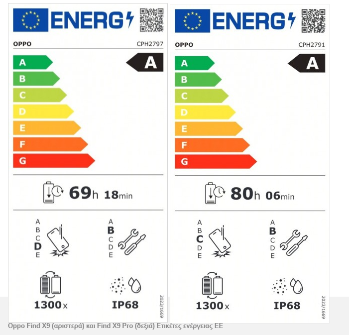 Oppo Find X9 (αριστερά) και Find X9 Pro (δεξιά) Ετικέτες ενέργειας ΕΕ