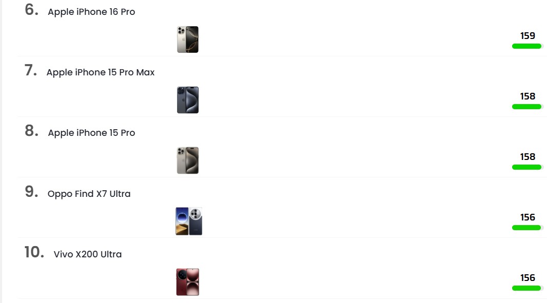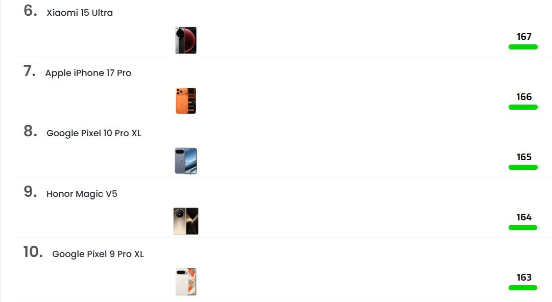 Η παρακάτω λίστα βασίζεται στα πιο πρόσφατα δεδομένα από την κατάταξη του DXOMARK, η οποία ανανεώνεται τακτικά για να αντικατοπτρίζει τις τεχνολογικές εξελίξεις. Σημειώστε ότι οι βαθμολογίες (DXOMARK overall score) μπορεί να διαφέρουν ελαφρώς ανάλογα με την έκδοση του πρωτοκόλλου δοκιμών.