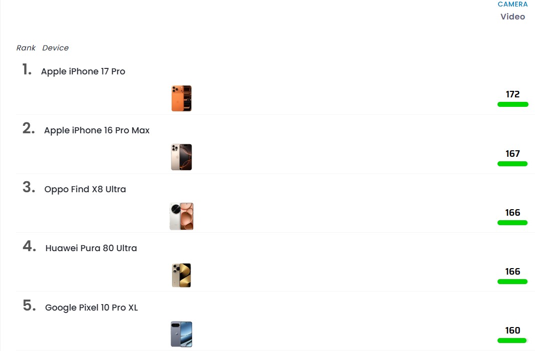 Σύμφωνα με την κατάταξη του DXOMARK, τα κορυφαία κινητά για φωτογραφία περιλαμβάνουν συσκευές όπως το Huawei Pura 80 Ultra, το Oppo Find X8 Ultra, και το Apple iPhone 17 Pro, τα οποία βρίσκονται στις υψηλότερες θέσεις της λίστας.